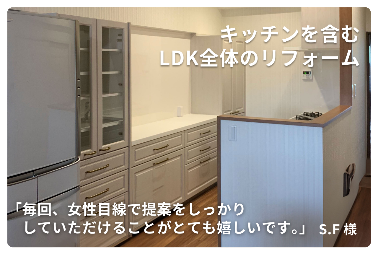 リフォーム内容 LDK全体の工事、オーダー造作収納、腰壁造作、家電背面スペース、ゾーニング設計